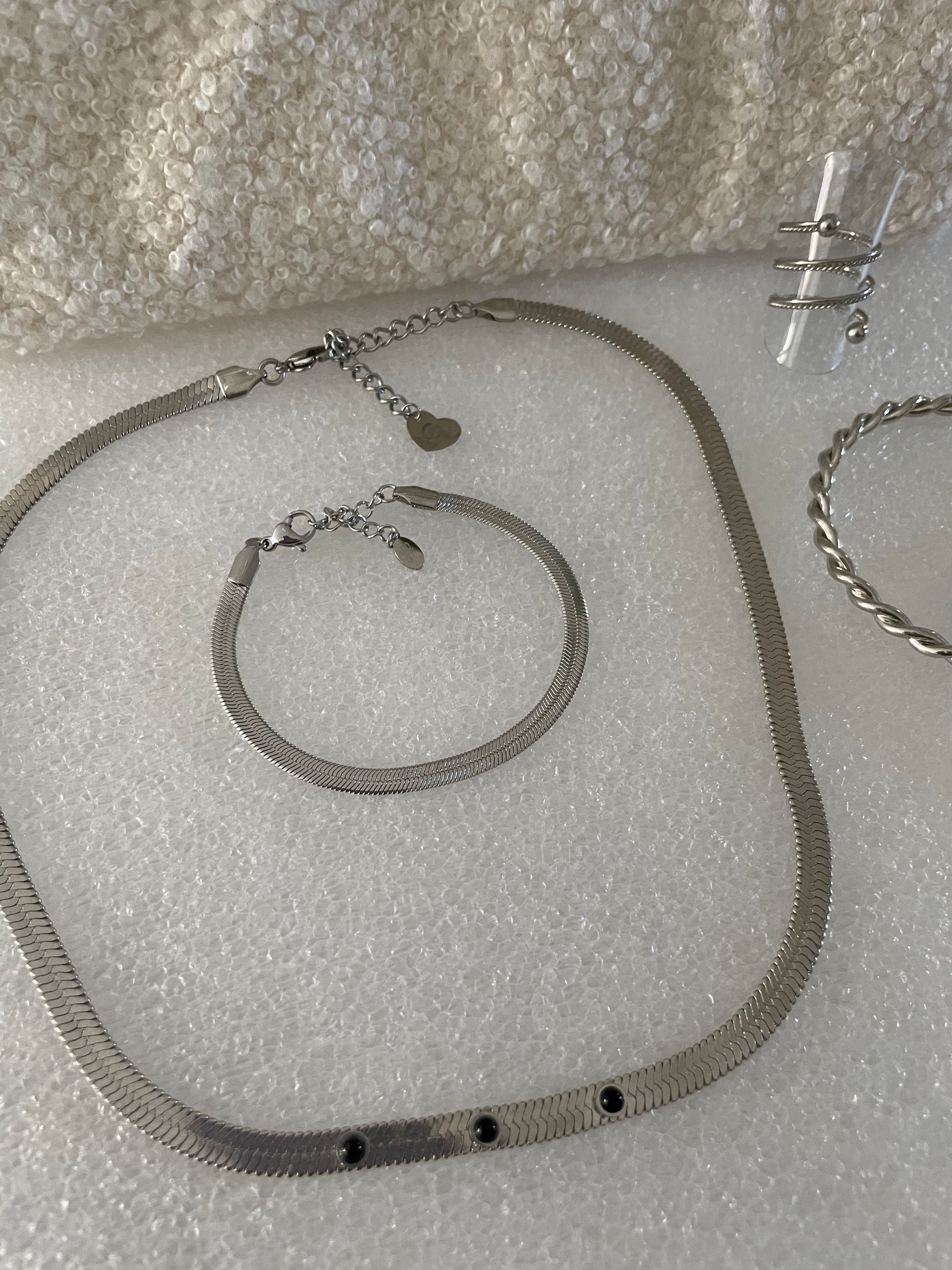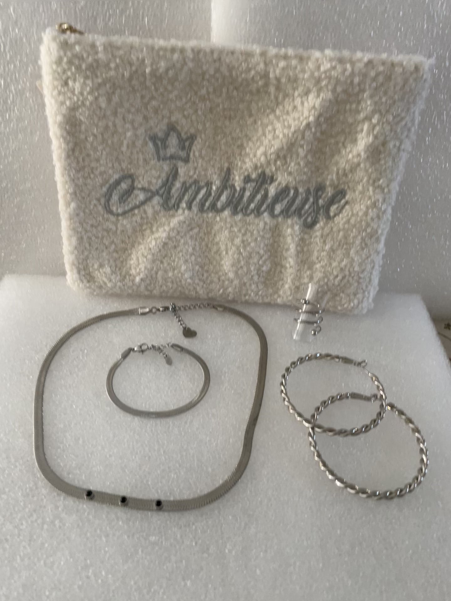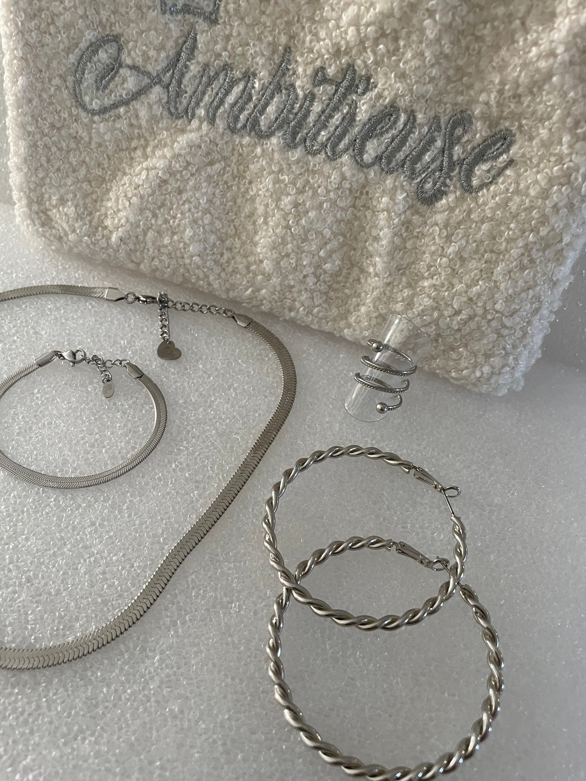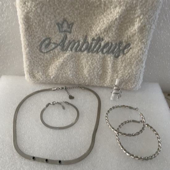 Celle-ci se compose d'une pochette dans laquelle nous avons mis un ensemble de bijoux en acier inoxydable. Une pochette et 4 bijoux différents à porter ensemble ou pas.