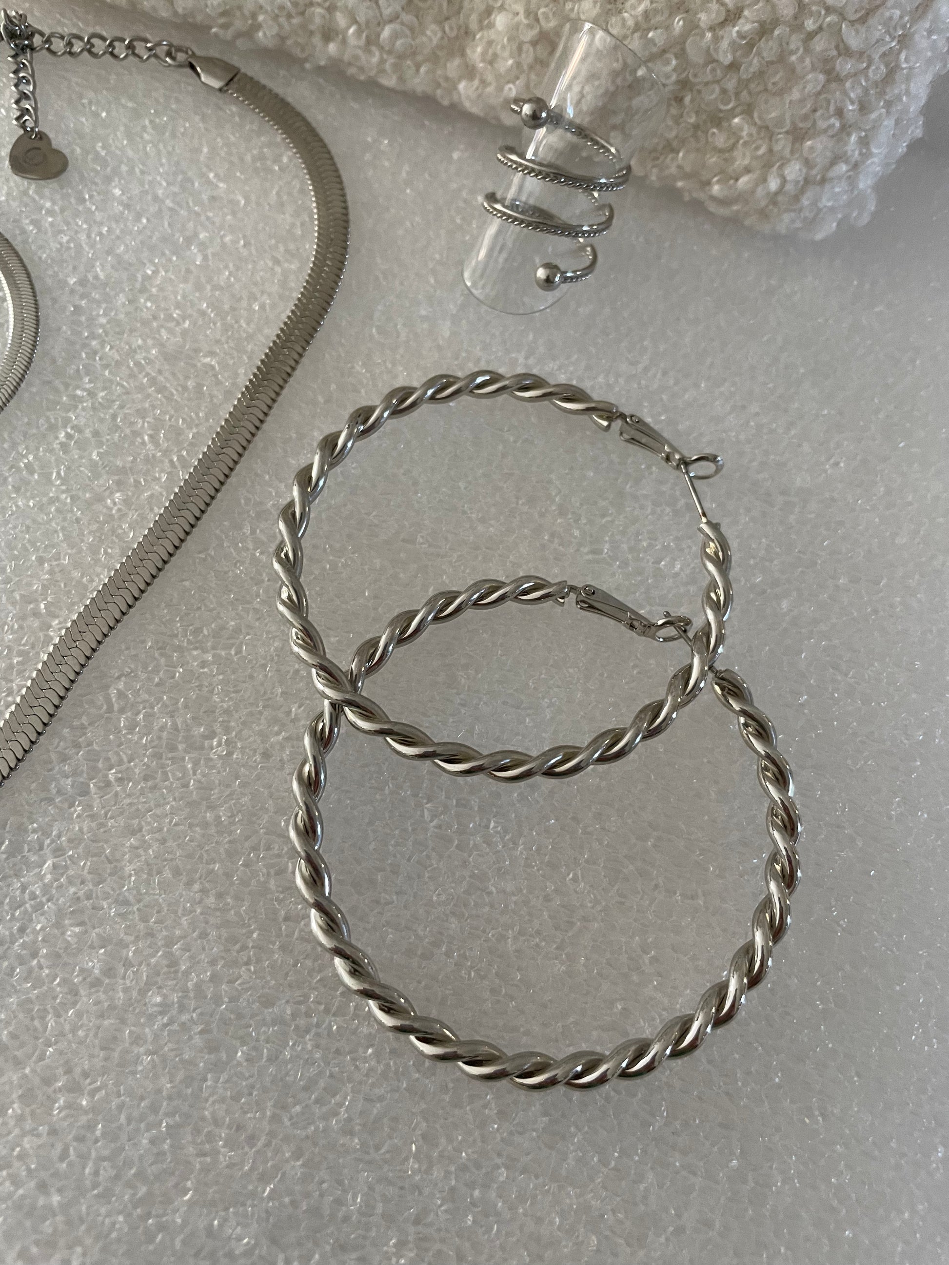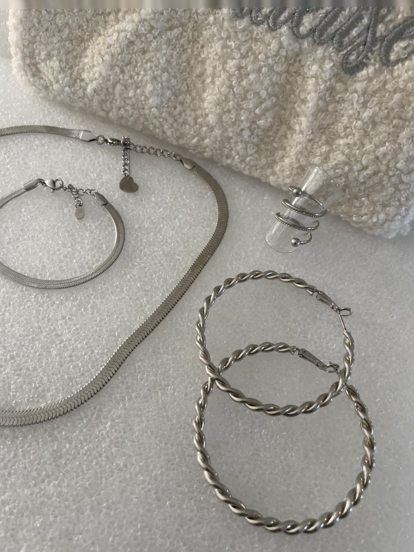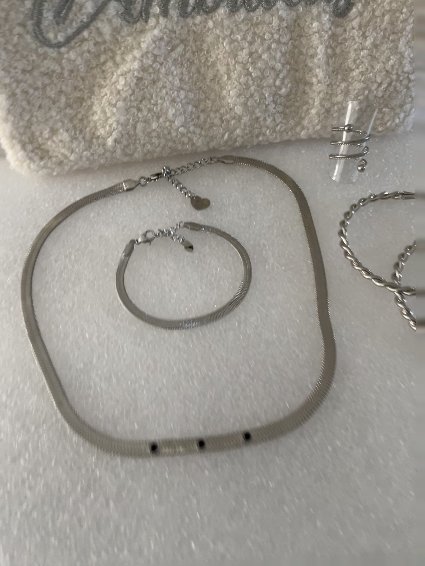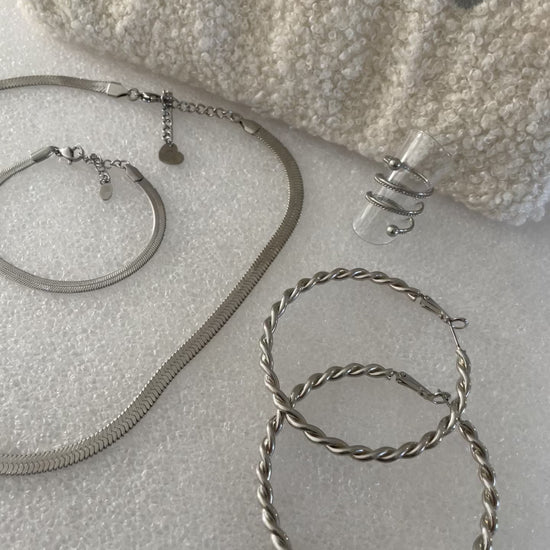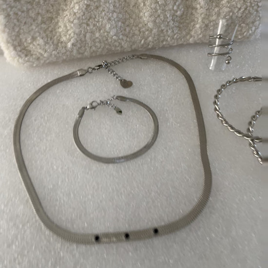 Celle-ci se compose d'une pochette dans laquelle nous avons mis un ensemble de bijoux en acier inoxydable. Une pochette et 4 bijoux différents à porter ensemble ou pas.