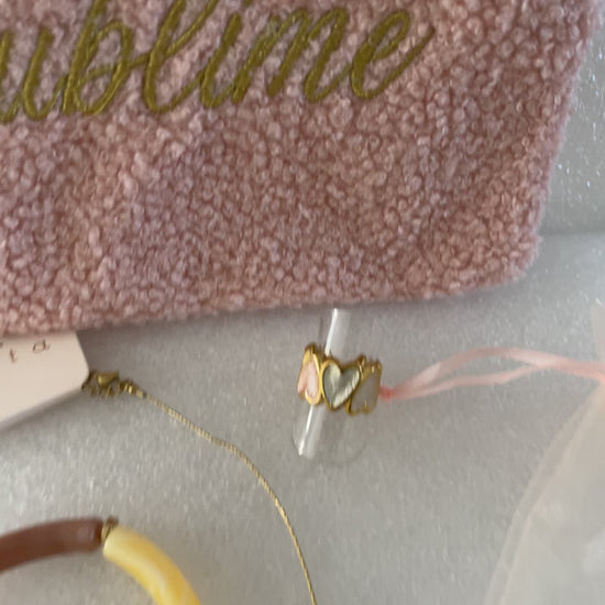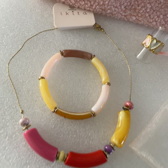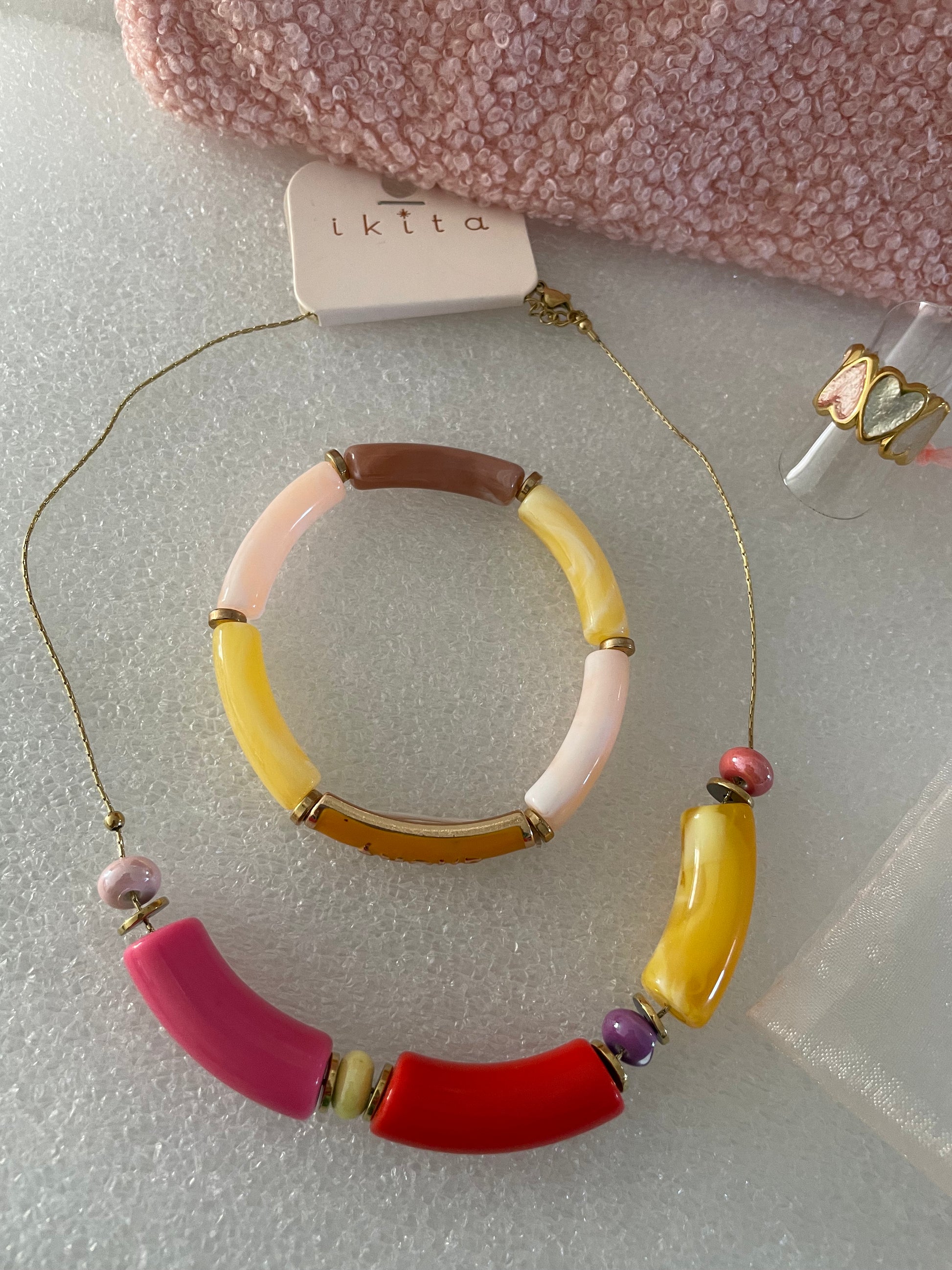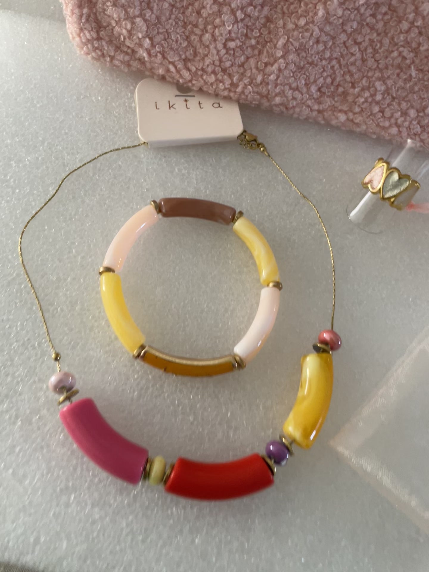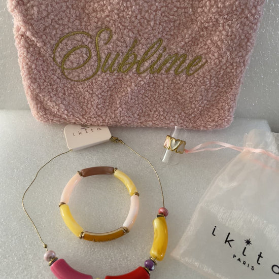 Celle-ci se compose d'une pochette dans laquelle nous avons mis un ensemble de bijoux en acier inoxydable. Une pochette et 3 bijoux différents à porter ensemble ou pas dont un collier de la marque Ikita Paris