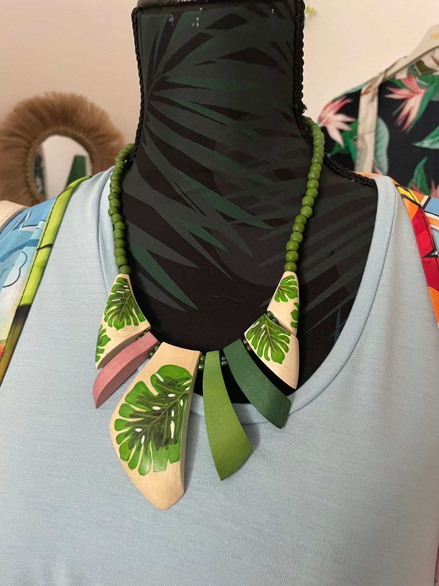 - Design Artisanal Unique : Ce collier se compose d'un assemblage de pièces de bois aux formes géométriques et organiques. Certaines sont peintes à la main de motifs luxuriants de feuilles tropicales, tandis que d'autres arborent des teintes unies de vert et une touche de rose poudré.