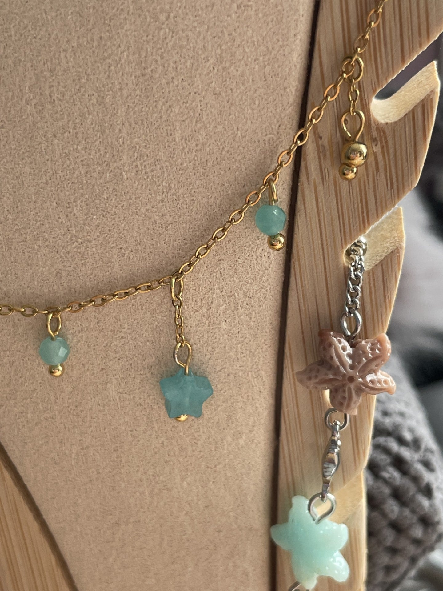 - Ornements : Petites pierres/perles facettées multicolores (bleu, rose, vert, blanc) et mini-charms (étoiles, perles rondes)