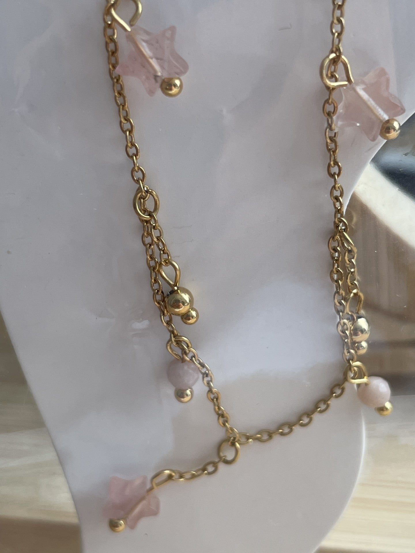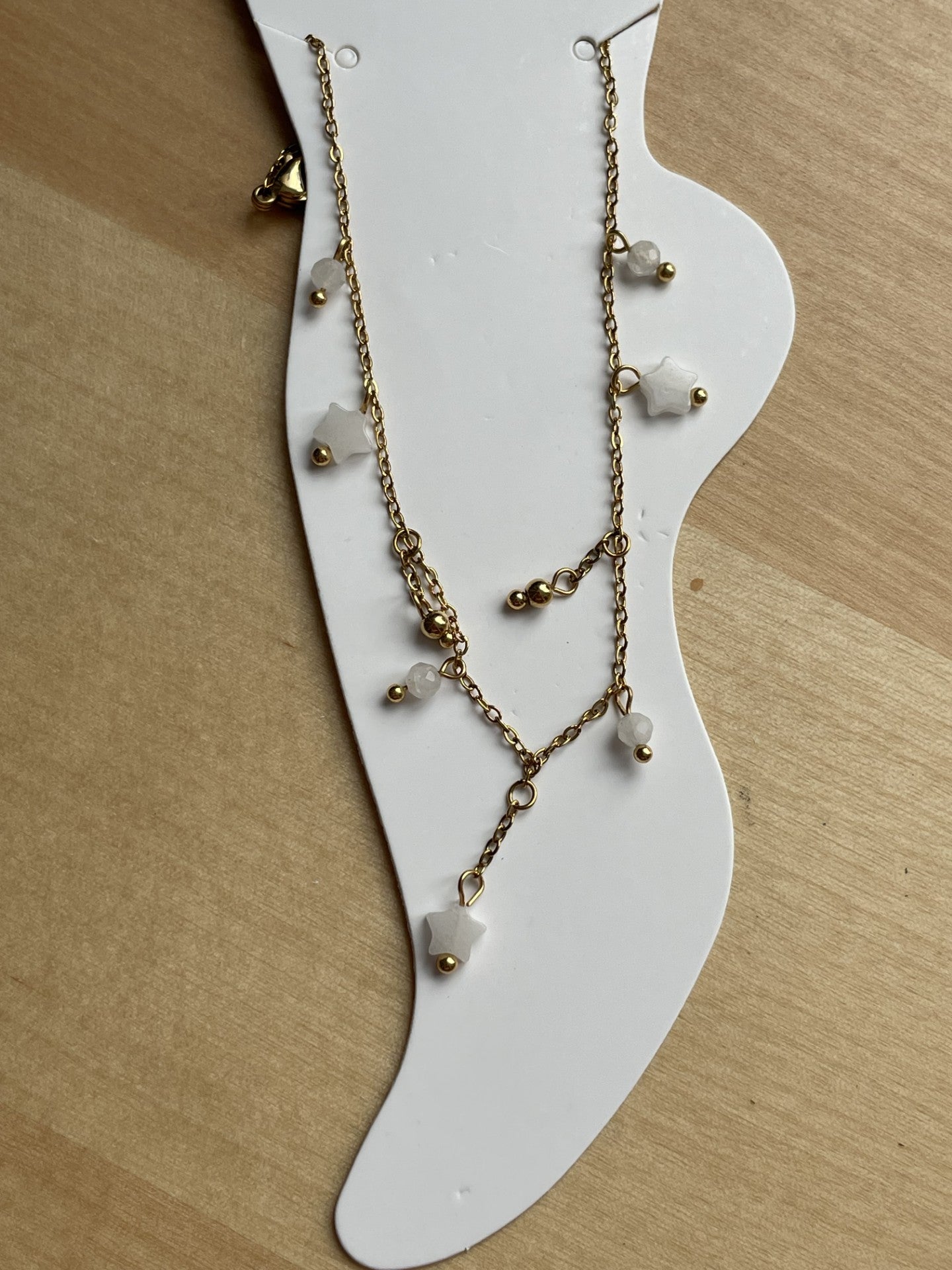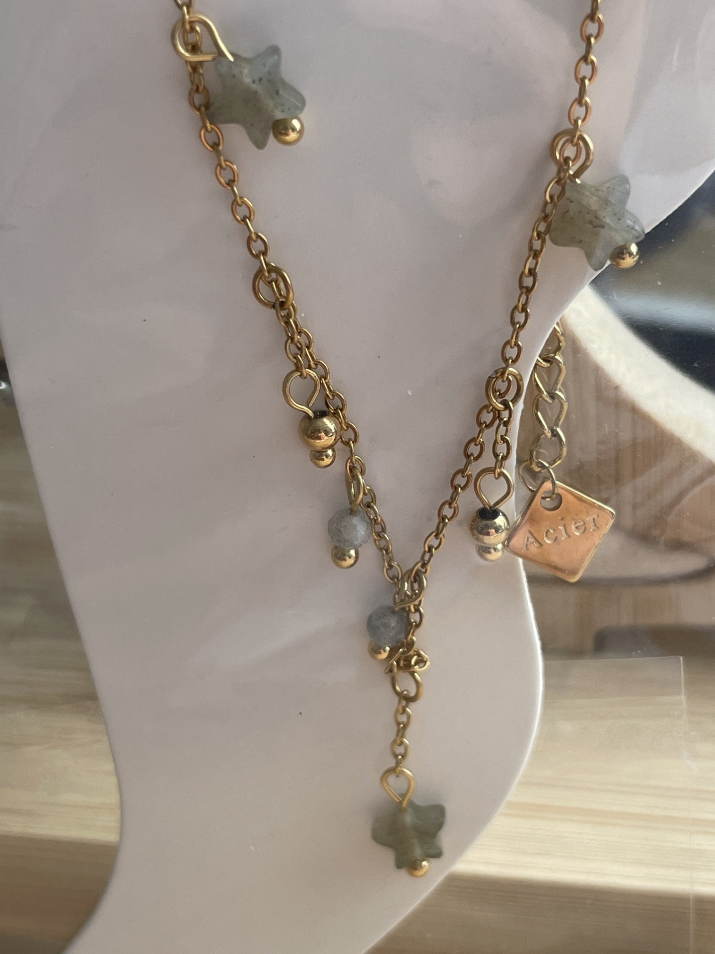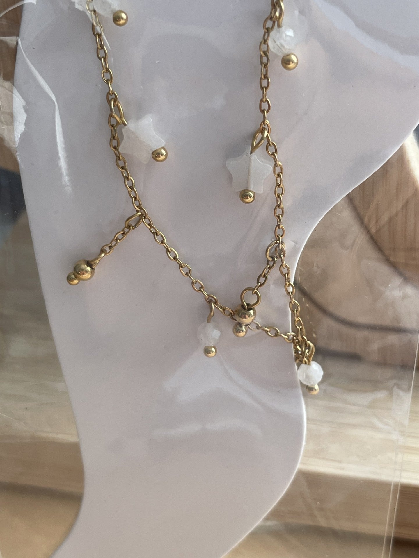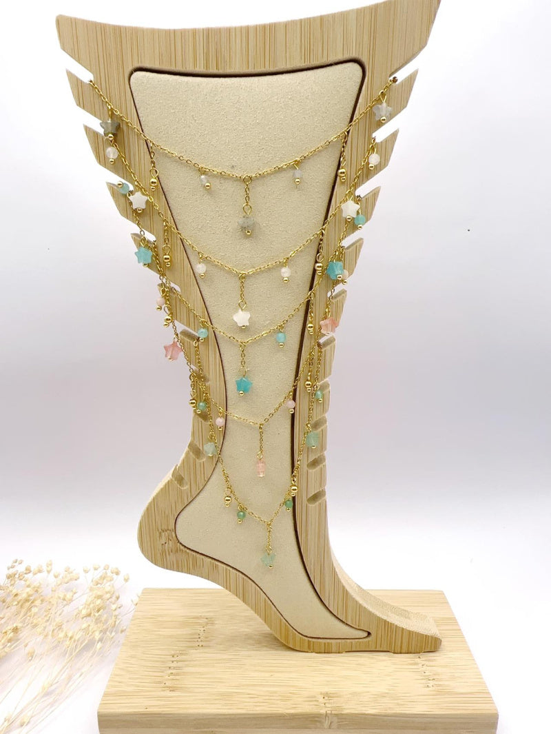 - Design Multicouches Élégant : Composée de plusieurs fines chaînes superposées, ornées de petites pierres et de mini-charms délicats (étoiles, perles, etc.), elle crée un effet d'accumulation tendance et raffiné.