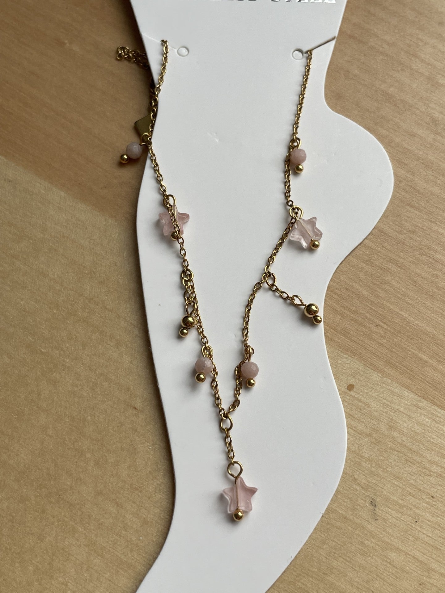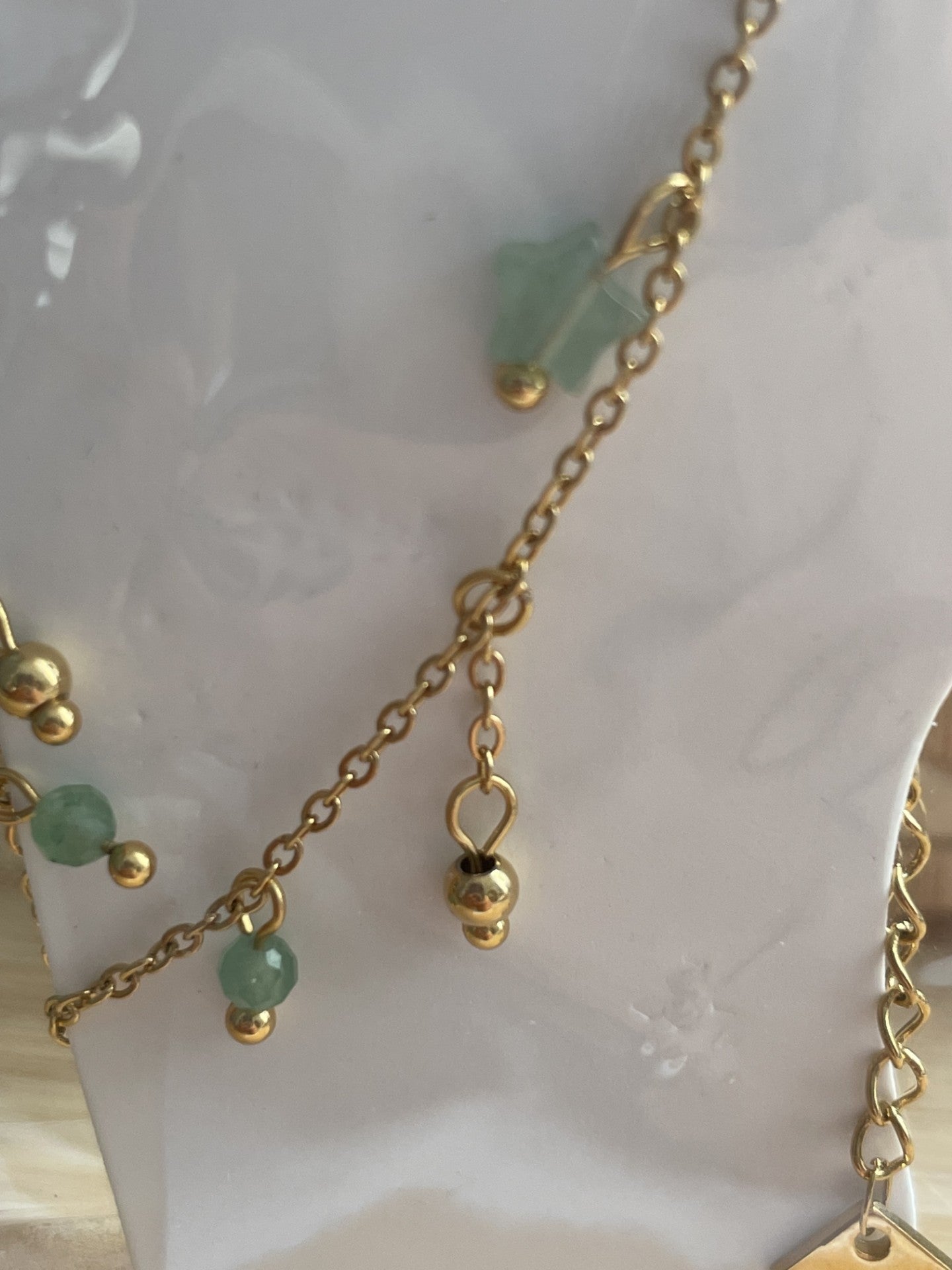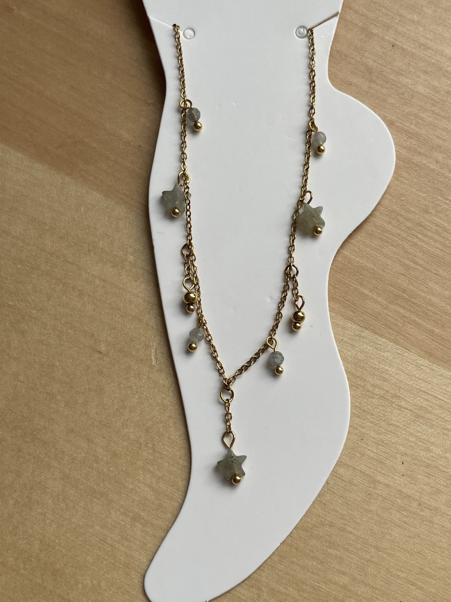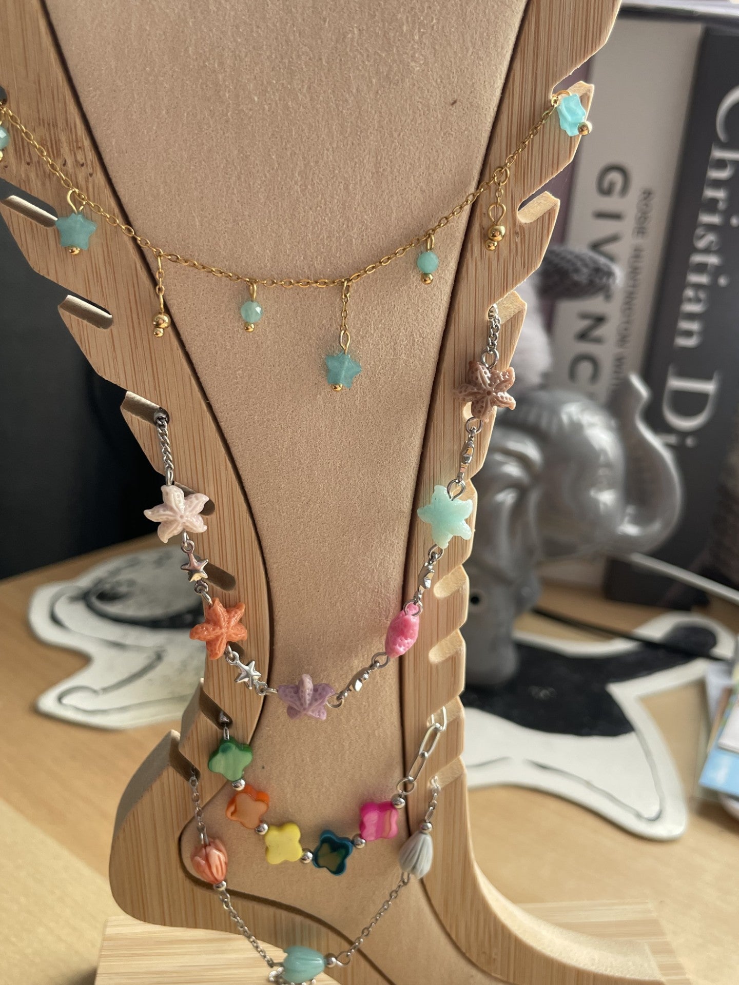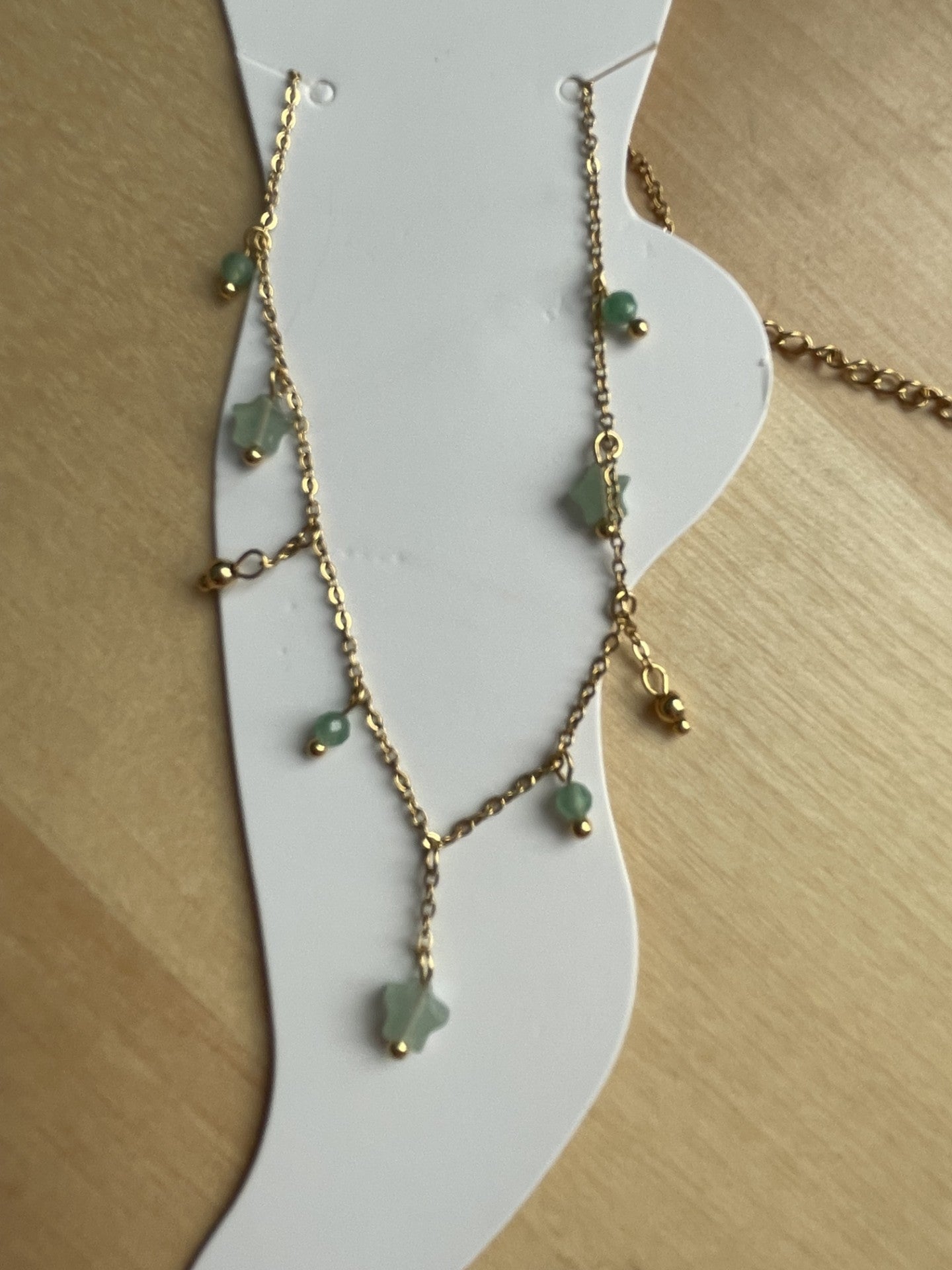 - Design Multicouches Élégant : Composée de plusieurs fines chaînes superposées, ornées de petites pierres et de mini-charms délicats (étoiles, perles, etc.), elle crée un effet d'accumulation tendance et raffiné.
