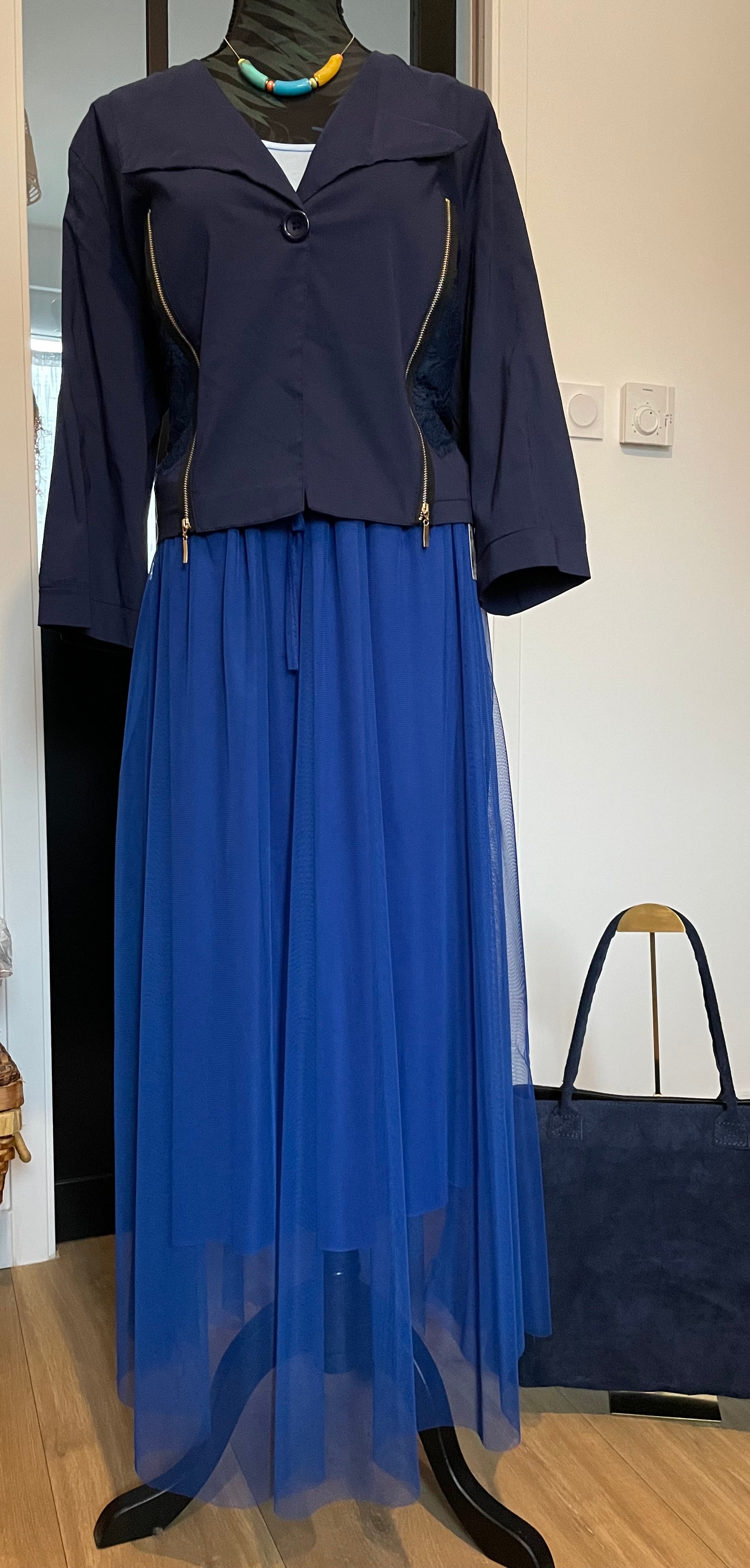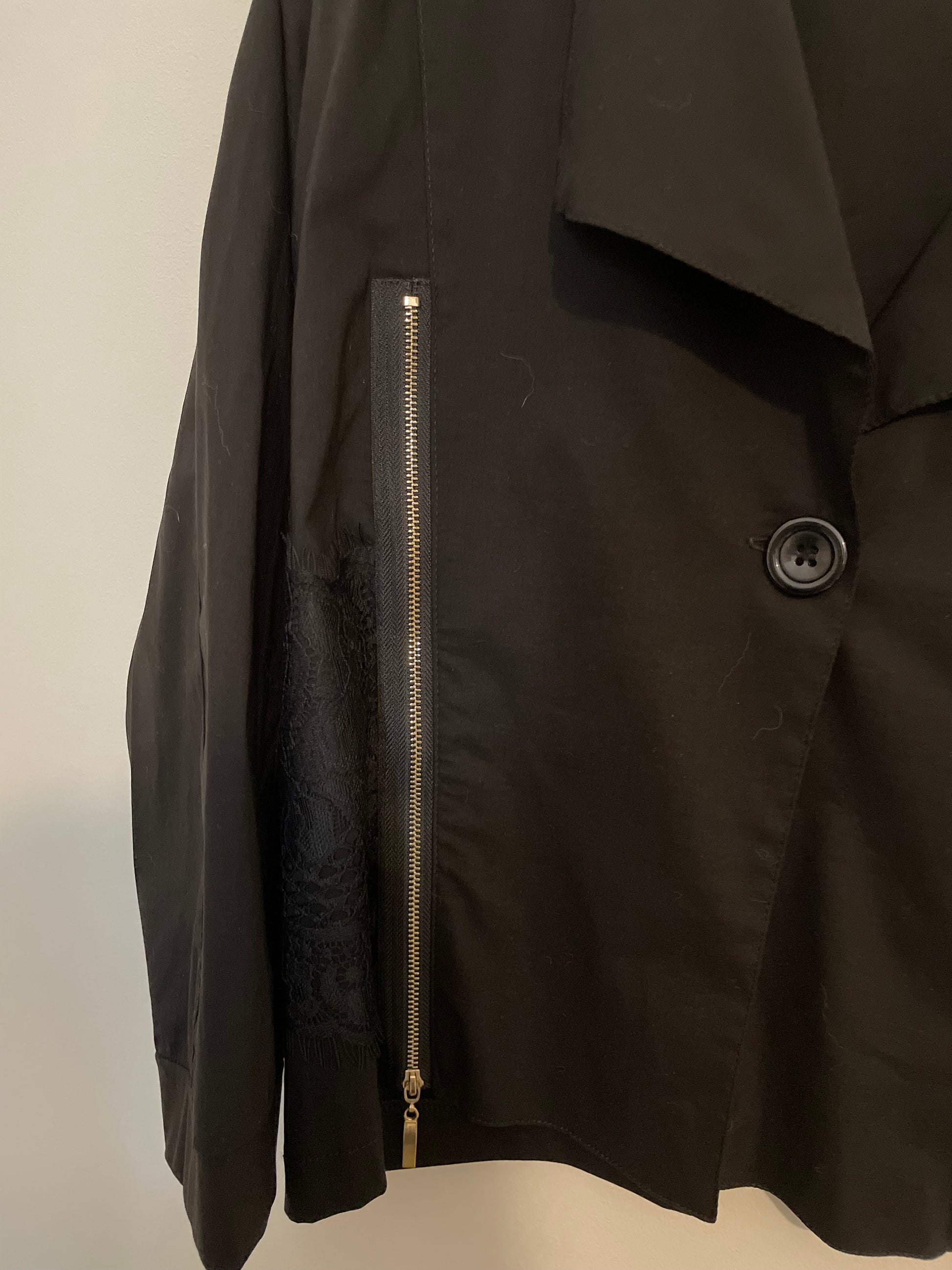 Veste ouverte, zips décoratifs, fermeture boutonnée, coupe droite et courte, empiècement en dentelle.